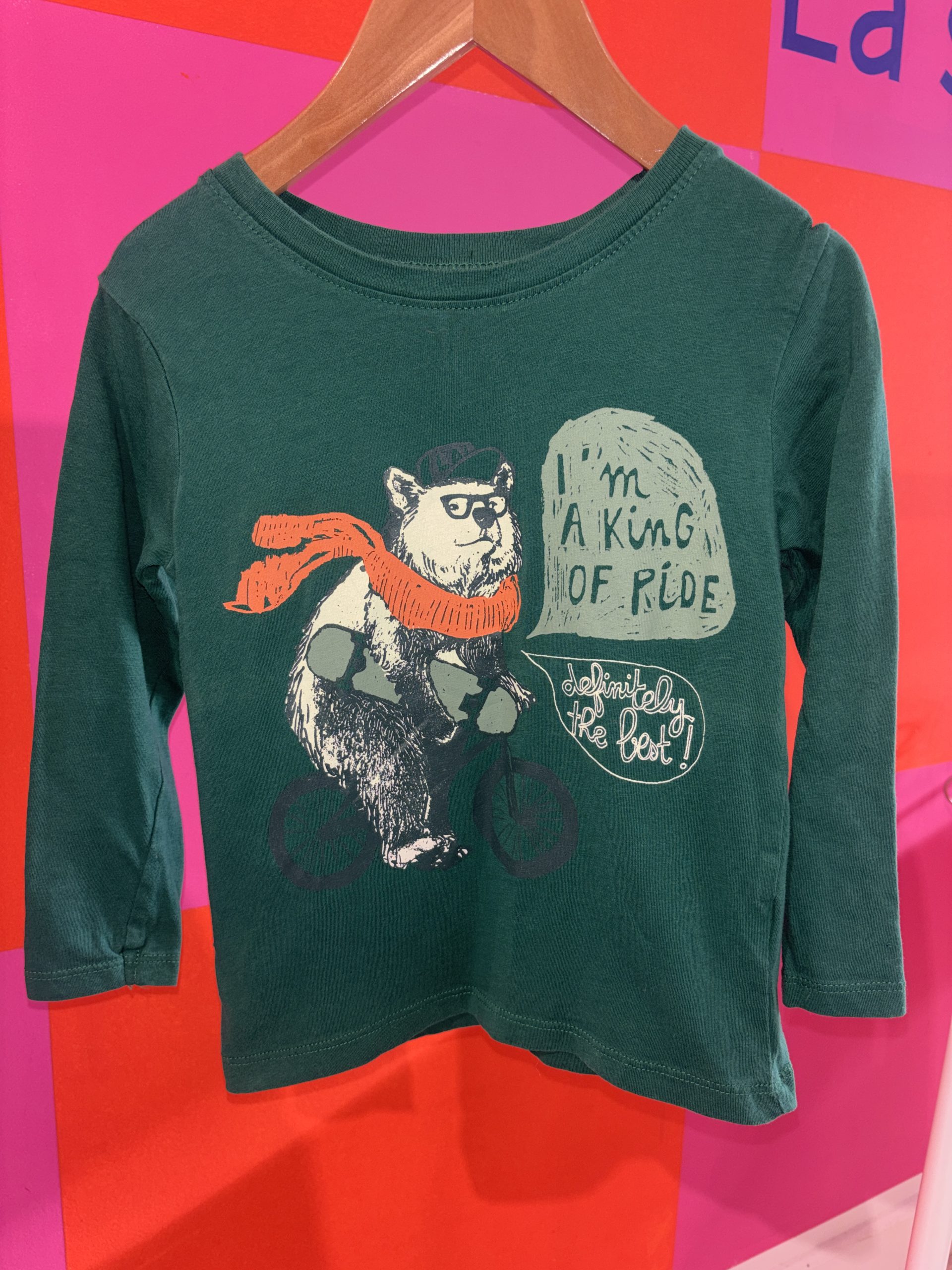Tshirt manches longues vert, ours à vélo, Tissaia 4 ans